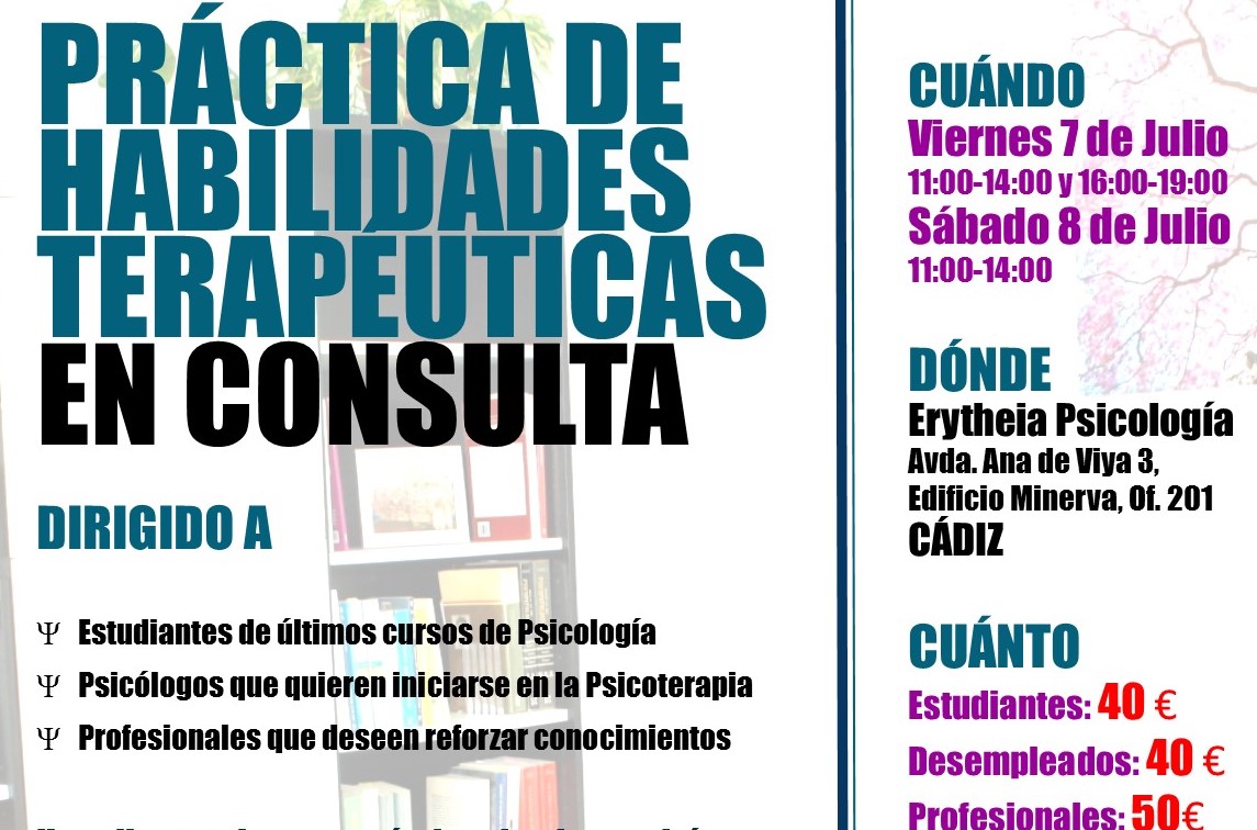 Siguiendo nuestro compromiso de ofrecer a la sociedad un trabajo psicológico de calidad, ponemos nuestra experiencia al servicio de los psicólogos/as que desean iniciarse en el trabajo psicoterapéutico, mediante un taller de iniciación a la práctica de habilidades terapéuticas. Se dirige principalmente a estudiantes de Psicologia de últimos cursos, psicólogos de reciente graduación, o profesionales que, o bien desean iniciarse en el campo de la psicoterapia, o bien desean reciclar conocimientos.