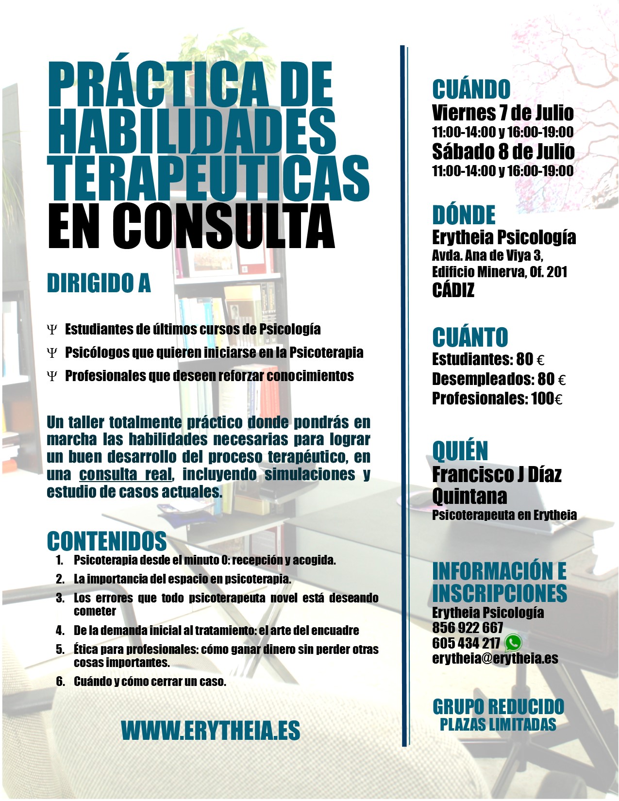 El lugar será nuestra propia sede, Erytheia Psicología, en Cádiz. Consideramos idóneo el propio entorno de la consulta, ya que esto permite que el participante observe y realice las prácticas en el mismo lugar exacto donde se atiende a los clientes de Erytheia.